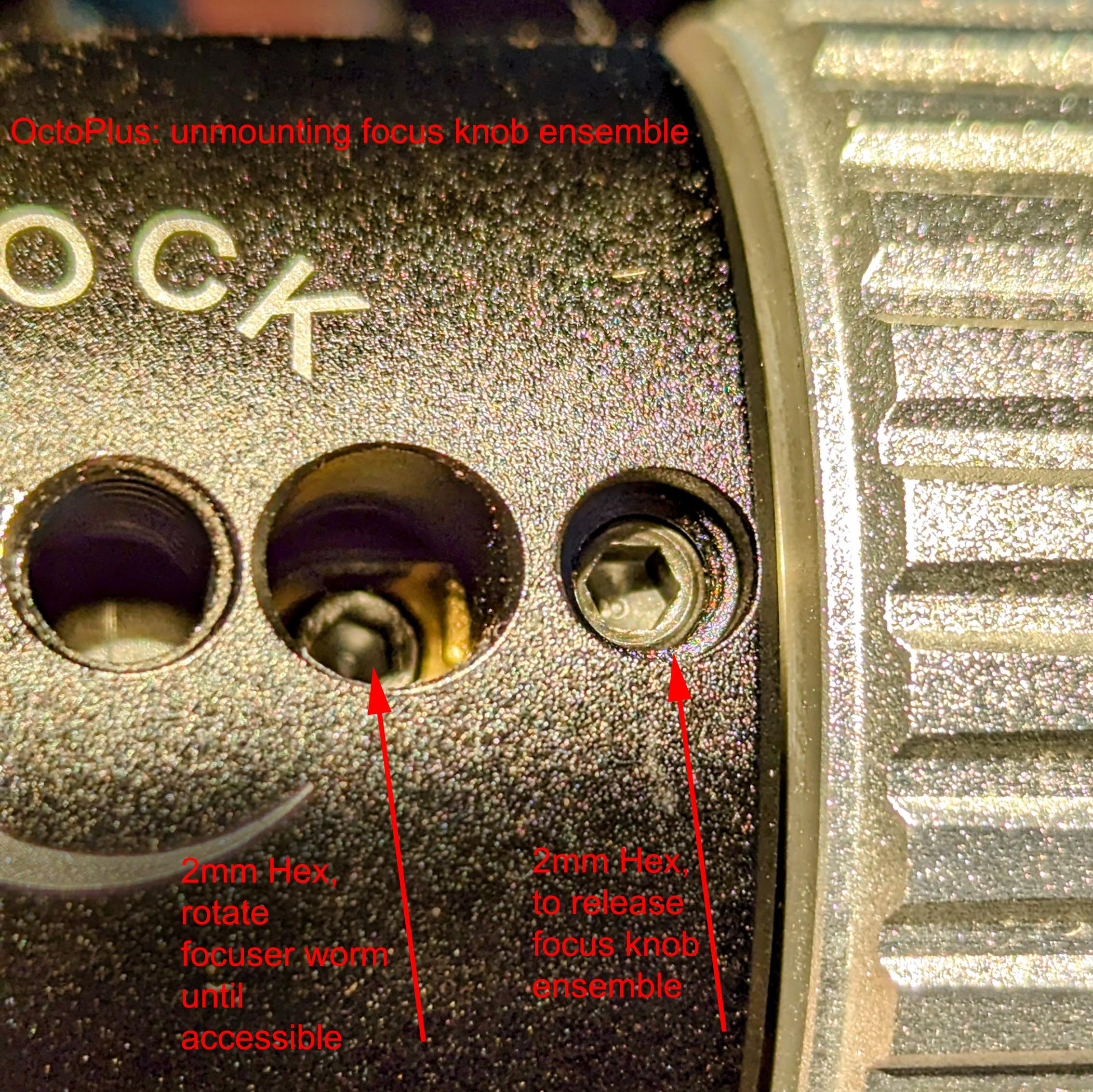 An der Fokuswelle ist die Mikrountersetzung mit 1 Madenschraube befestigt, 2mm Inbusschlüssel nehmen, erreichbar durch das Serviceloch ohne Gewinde unter "lock".