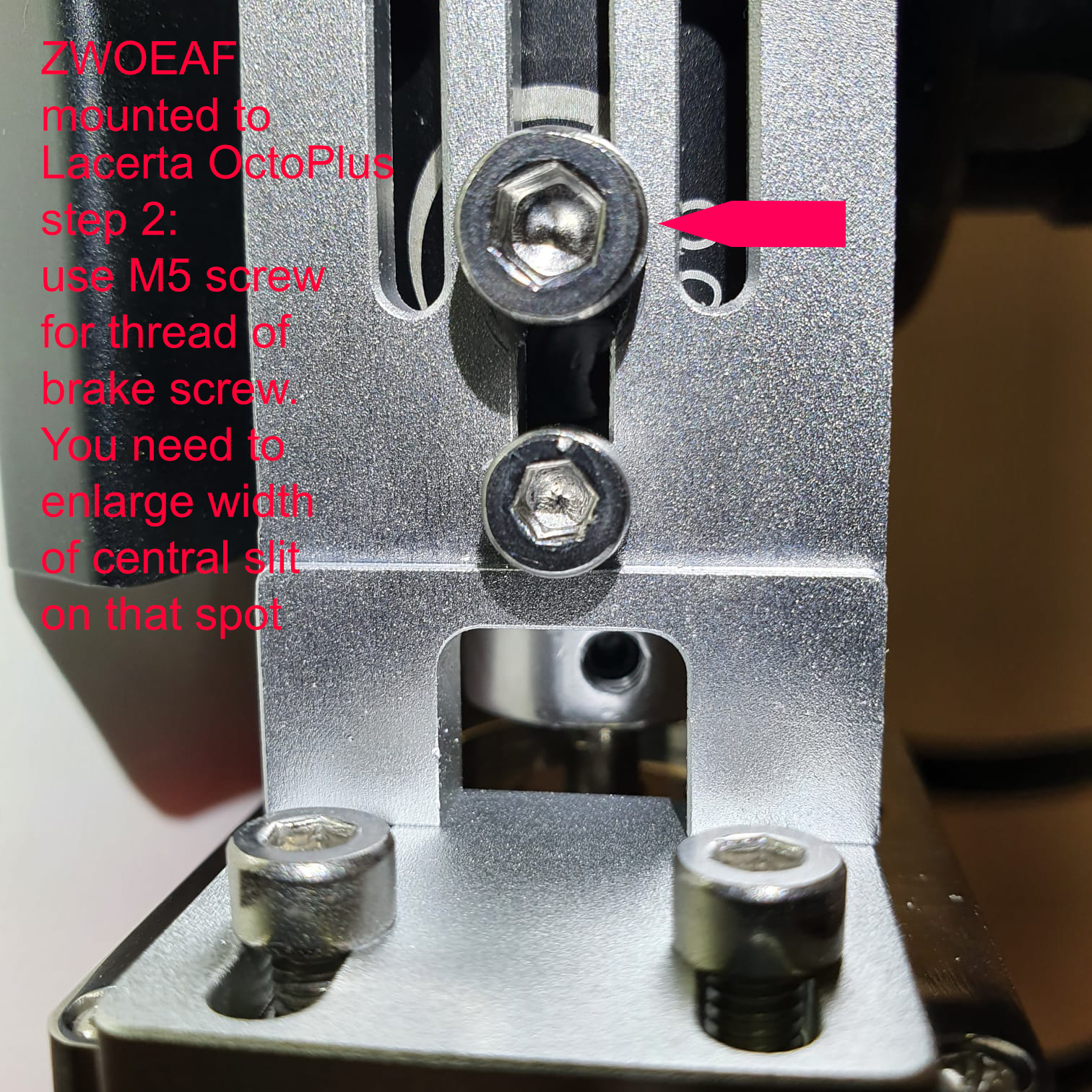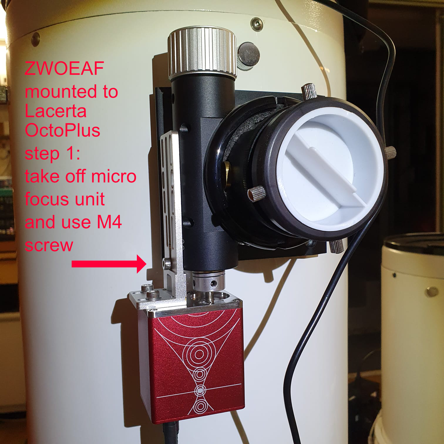 Der Körper des OctoPlus ist über 4 Inbusschrauben mit der Basis verschraubt, welche von der Unterseite der Basis zugänglich sind. Halten Sie zuerst den OctoPlus mit Basis über das Loch im Tubus wo er montiert werden soll, und prüfen Sie von der Innenseite des Tubus ob Sie die 4 Inbusschrauben von dort aus sehen und festschrauben können. Wenn das Tubusloch größer als 80mm ist, sollte dies möglich sein. Lösen Sie dann den Körper des OctoPlus von der Basis und schrauben Sie zuerst die Basis am tubus an. Nachher können Sie den den Körper über diese 4 von innen zugänglichen Schraubverbindungen befestigen. Beachten Sie, daß der Körper 4 um 90° versetzten Positionen befestigt werden kann! Fotos finden Sie im Support Tab.